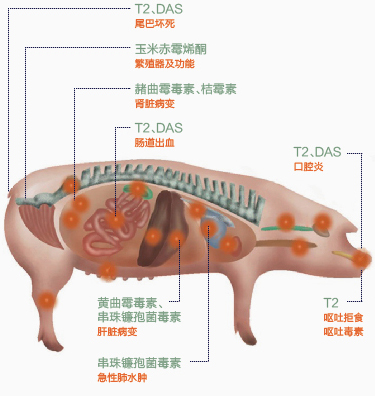 免疫抑制、侵害消化道(口部、胃及肠道病变),采食量减少,口腔、皮肤及关节溃烂,拒食、呕吐,神经失调