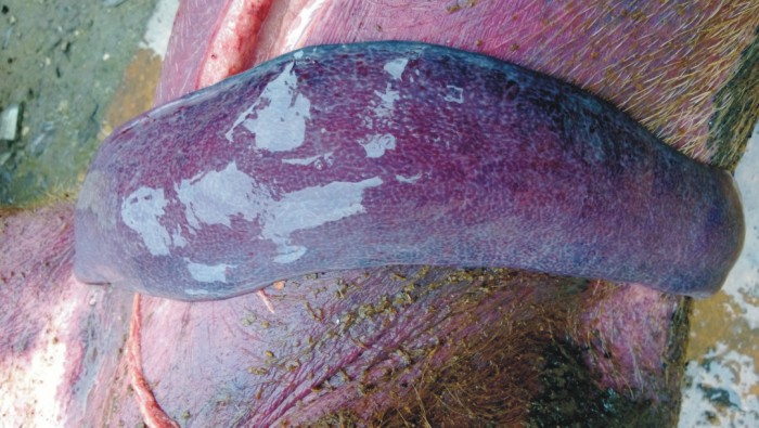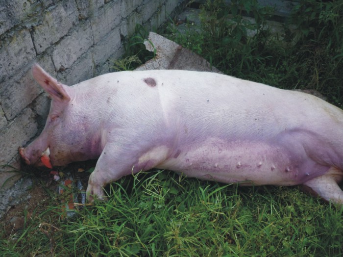 3、急性病例突然后驱不能站立或突然倒地,病急性死亡;濒死时口鼻流出白色或血色泡沫状液体,死后腹部快速胀大; 4、另有部分猪只出现腹泻、呕吐等症状;