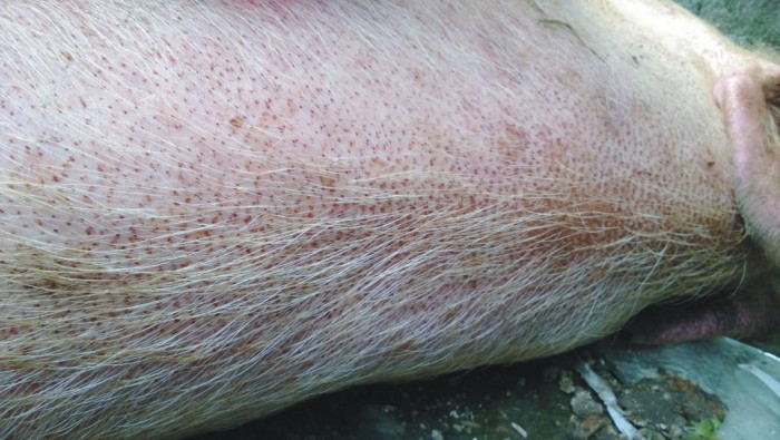 2、部分猪只耳、吻突、嘴、臀部、腹下等处出现瘀斑或皮肤发红发紫;个别猪只肩背部毛孔铁锈样出血;走路摇晃或后躯无力;球状结粪;